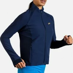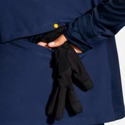 Bad weather or treadmill? The women’s Brooks Fusion Hybrid jacket makes it an easy choice to head outside. It resists wind and water and stows in its built-in backpack when the skies clear.